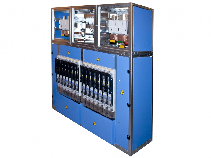 Шкаф представляет собой горизонтально расположенные сборные шины, на которые установлены выключатели-разъединители-предохранители («фидеры») с вертикальным расположением фаз одного присоединения. Каждый фидер выполняет функции разъединителя и защиты от перегрузок и коротких замыканий подключаемой к нему снизу кабельной линии. Для питания и защиты потребителя с номинальным током более 630А применяются комбинированные шкафы - с модулем защиты отходящей линии автоматическим выключателем.